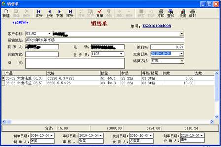 d) 銷售訂單由銷售部門開具,信息包括:客戶名稱、客戶代碼、聯(lián)系地址、聯(lián)系電話、合同號、訂單期限,產(chǎn)品信息,如下所示: