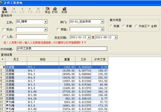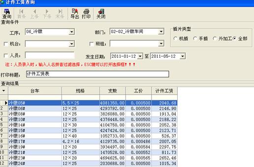 j) 各車間工序工作量自動計算,工價設置好后,能自動計算計件工資。如下圖: