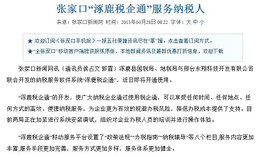 張家口新聞網(wǎng)報(bào)道涿鹿縣國稅局、地稅局與我公司聯(lián)合研發(fā)的“涿鹿稅企通”,以下是網(wǎng)站截圖: