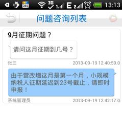 對于前面納稅人提交的問題“請問這月征期到幾號?”,稅務機關做了答復,納稅人可以通過“問題查詢”功能查詢提交的問題答復是“由于營改增這月是第一個與,小規模納稅人征期延遲到23號結束,請及時申報”。