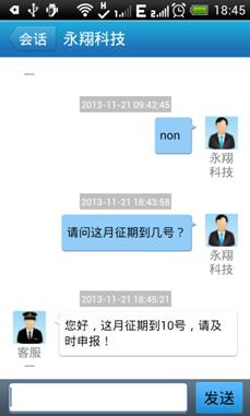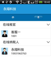 向在線稅官咨詢,點開在線稅官,如“客服一”,可以即時于在線的稅務機關客服人員提問咨詢,如圖2.15所示。納稅人“永翔科技”咨詢“請問這月征期到幾號?”,稅務機關人員“客服一”即時答復“您好,這月征期到10號,請即時申報!”。這樣就完成了一個咨詢和答復的過程。