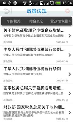 政策法規包括增值稅類、所得稅類、消費稅類、車購稅類、綜合其它、營改增專題等六大類,提供最新最全的政策法規信息。如圖2.34所示。